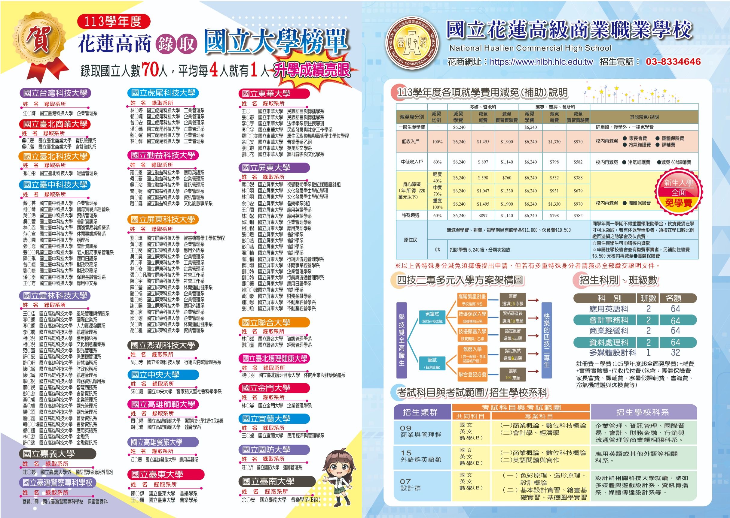 ![]() 114花蓮高商招生DM正面 880K 115/3/2 | ![]() 114花蓮高商招生DM背面 1088K 115/3/2 | ![]() 114花蓮高商簡介 11469K 115/3/2 | ![]() 115花蓮高商招生科別(新設科) 216K 115/3/2 |